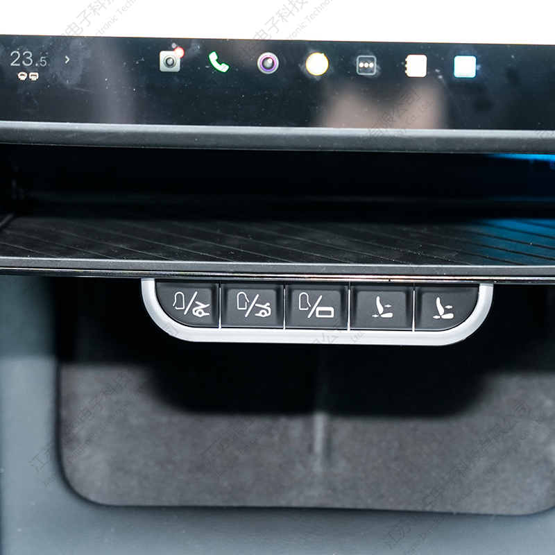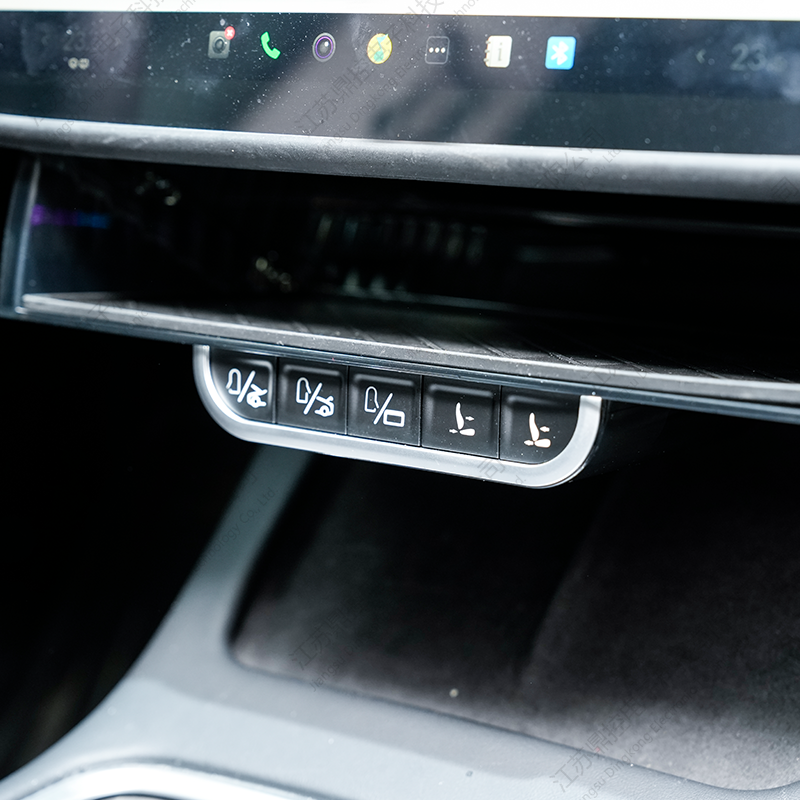 Cinco botones metálicos táctiles están cuidadosamente dispuestos debajo de la bandeja, brindando acceso intuitivo a funciones esenciales del vehículo. Cada botón responde con un clic nítido, brindando a los usuarios una sólida sensación de control. Las funciones incluyen abrir y cerrar las puertas delanteras, los baúles delantero y trasero y controlar la tapa del puerto de carga, todo accesible instantáneamente al alcance de su mano.